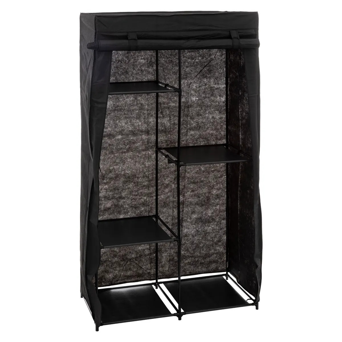 Mobiele opvouwbare kledingkast in de kleur zwart die u bijvoorbeeld kan gebruiken op de zolder of camping. De kast is makkelijk in elkaar te zetten en heeft 2 ritsen aan de voorkant, welke u over het geraamte kunt schuiven zodat uw kleding schoon blijft. De kast heeft 5 legplanken en 3 hang opties. Afmetingen kast: 88 x 46 x 169 cm.