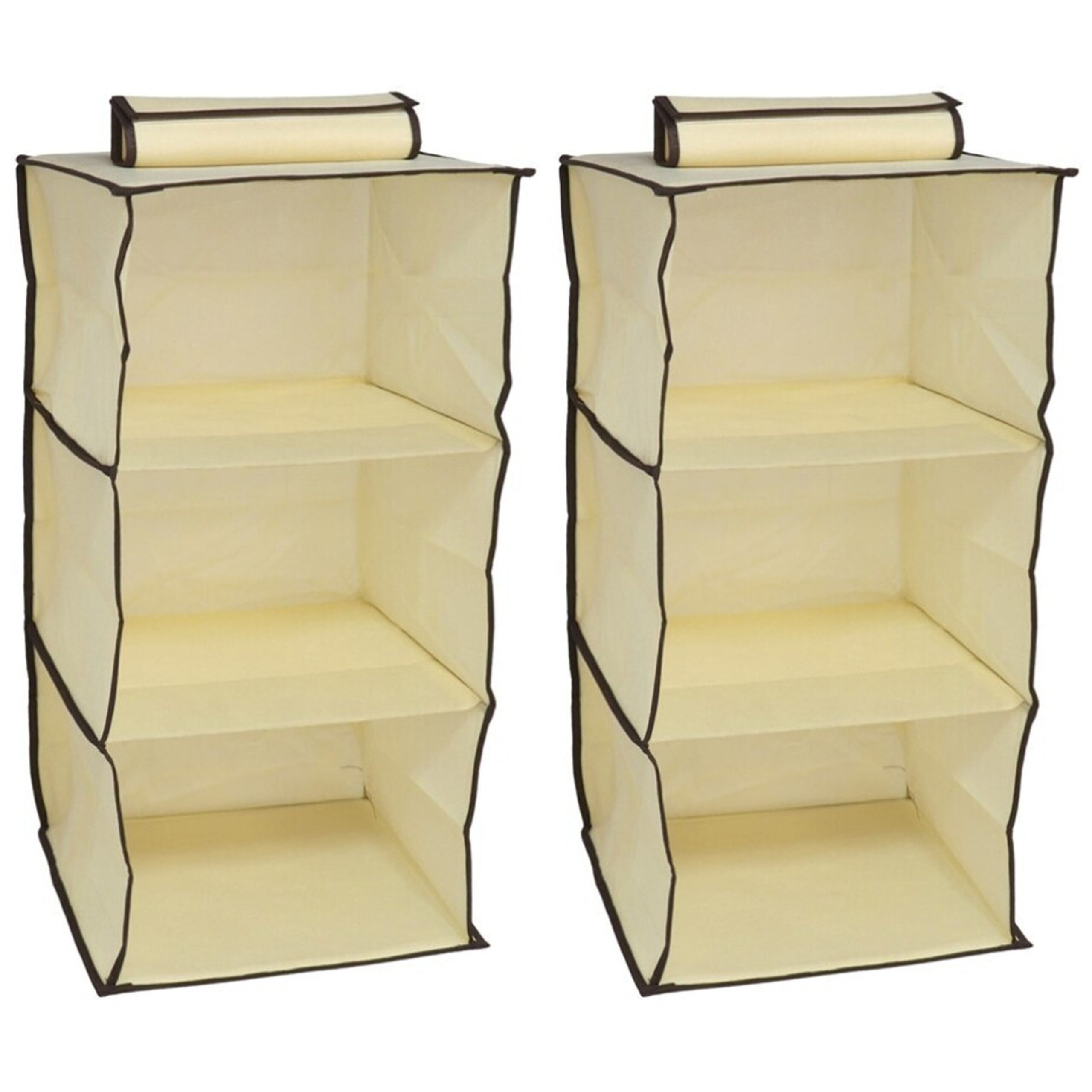 2x gerimport hang opbergkast voor op de camping of gewoon voor thuis. Op zoek naar extra opbergruimte op de camping, in de caravan of gewoon thuis? Deze opvouwbare hangkast in beige is d? slimme oplossing! Hang ?m zo aan een tentstok, kastroede of haak en je hebt in ??n klap meerdere legniveaus tot je beschikking. Ideaal voor kleding, handdoeken of andere spulletjes die je graag overzichtelijk opbergt. Lichtgewicht, snel op te hangen ?n net zo snel weer opgevouwen als je hem niet nodig hebt. Compact in vorm, groots in gemak! Afmeting: ca. 30 x 60 cm. Kleur: beige. Materiaal: non woven stof. Gewicht: 1.5 kilo.