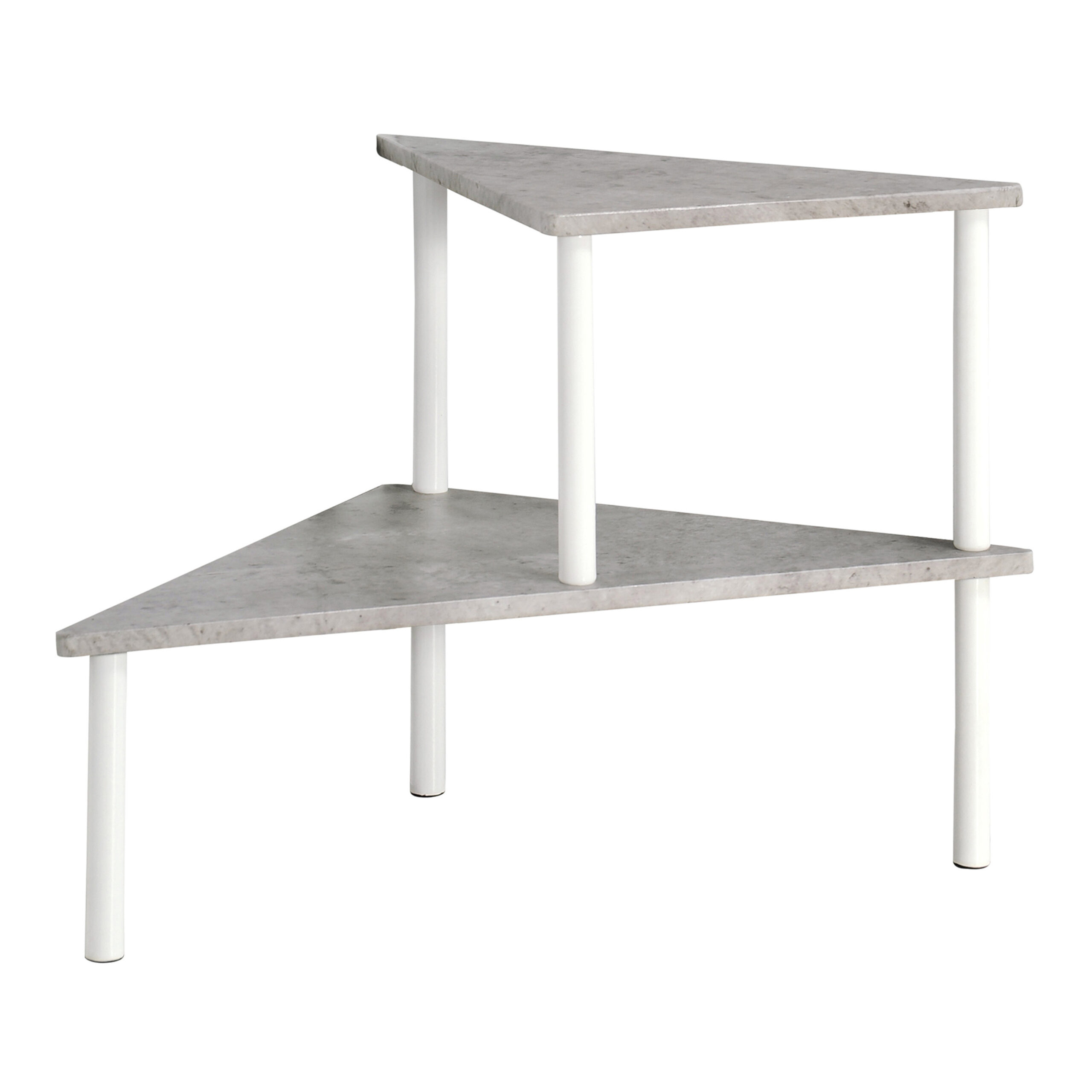 Gemaakt van hout in het grijs beton look en metalen pootjes in het wit. Afmetingen: 53 x 38 x 38 cm.