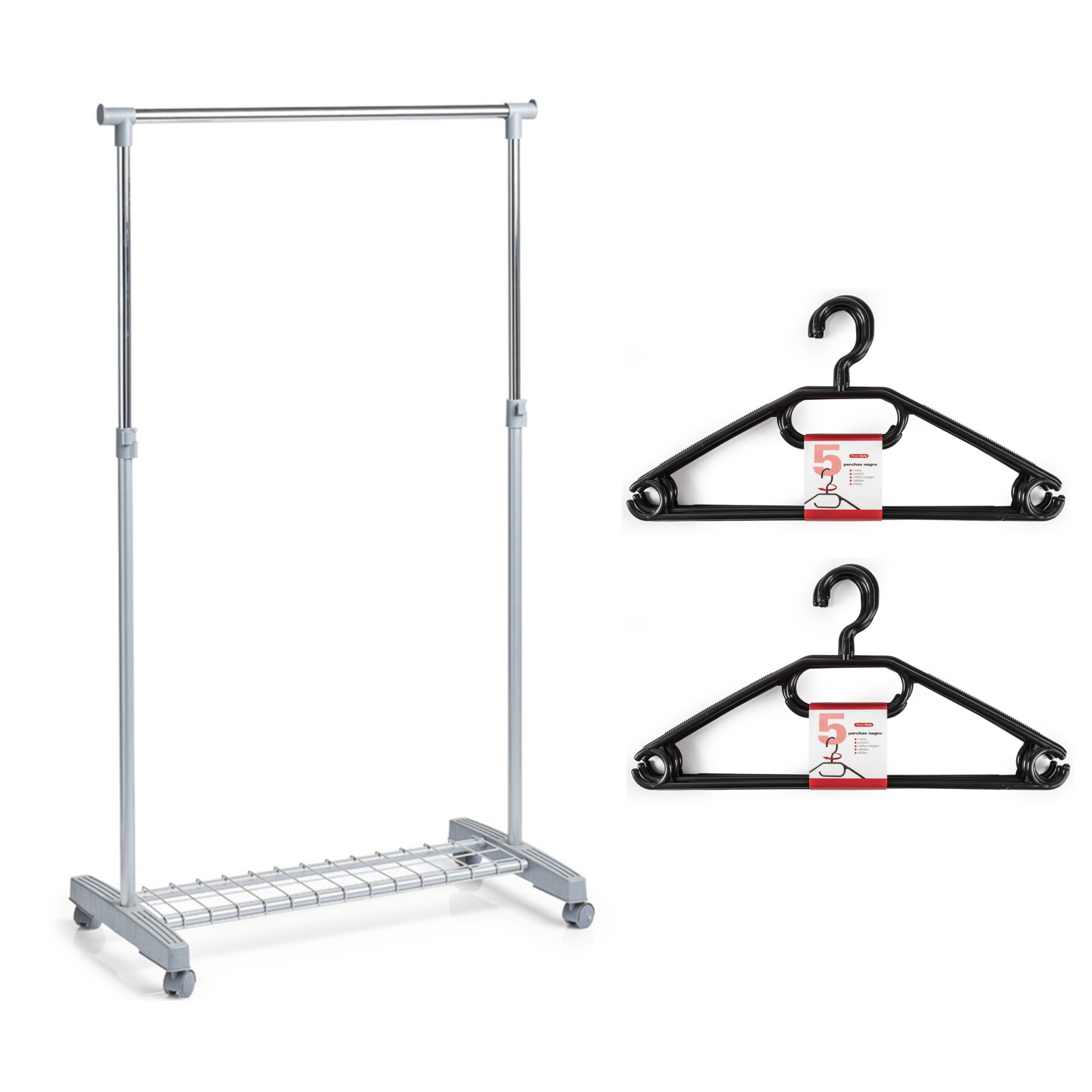Kledingrek met enkele hangkleding stang gemaakt van kunststof(PP) en rvs metaal in de kleur grijs. Inclusief 10x kleding hangers, gemaakt van kunststof, in het grijs. Hoek model of recht te gebruiken. Afmetingen: 83 x 43 x 170 cm. Uitschuifbare hoogte van 93 tot 170 cm. Makkelijk te verplaatsen met de zwenkwielen. Zelf monteren. Draagvermogen maximaal 10 kilo. Handig kledingrek voor slaapkamer en/of zolder. , Dit artikel bestaat uit:, 1x Mobiel kledingrek verstelbare enkele stang 170 cm, 2x Kledinghangers – 5x stuks – kunststof – zwart – B40 cm