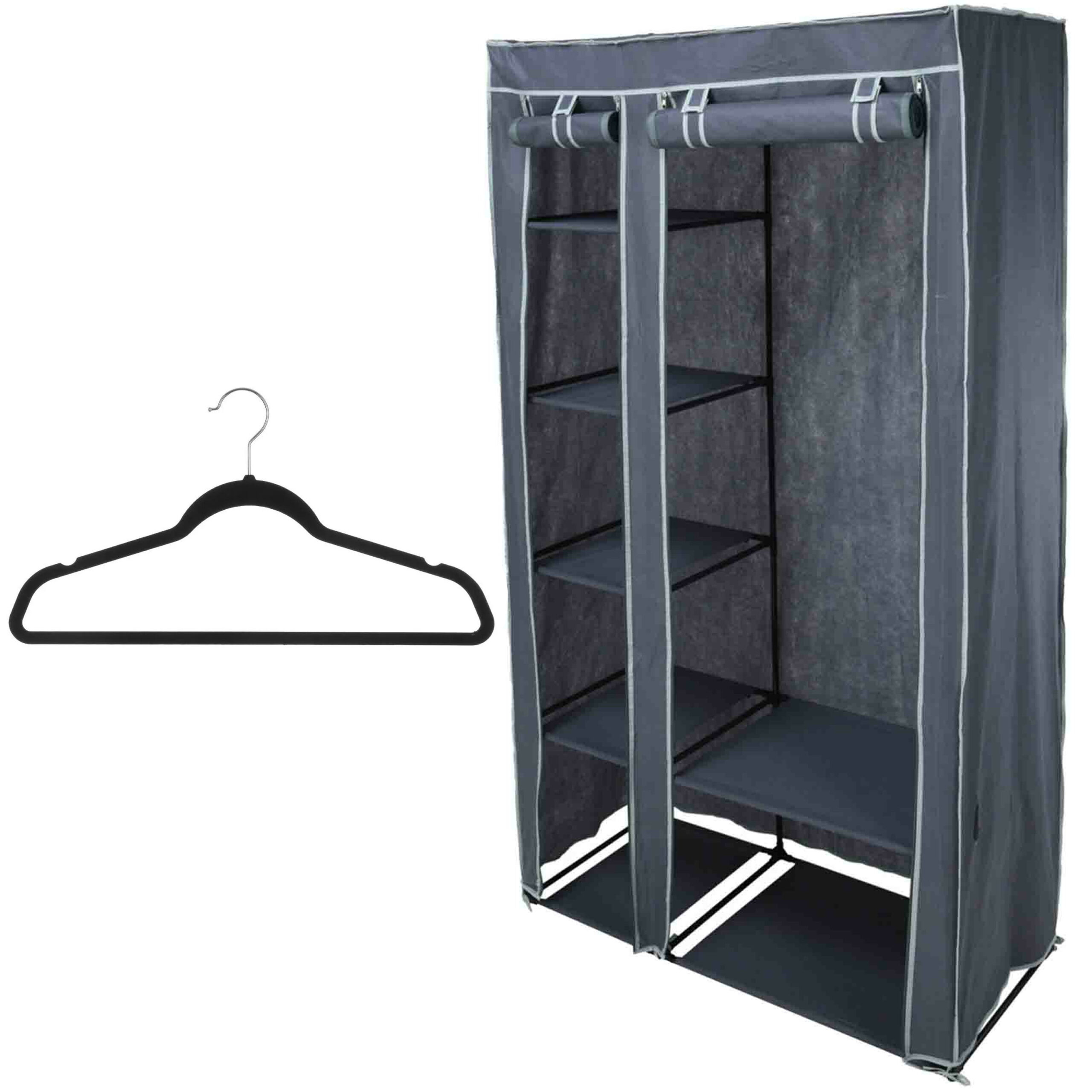 Set van mobiele opvouwbare kledingkast met blauwe hoes 160 cm en 20x plastic kledinghangers zwart