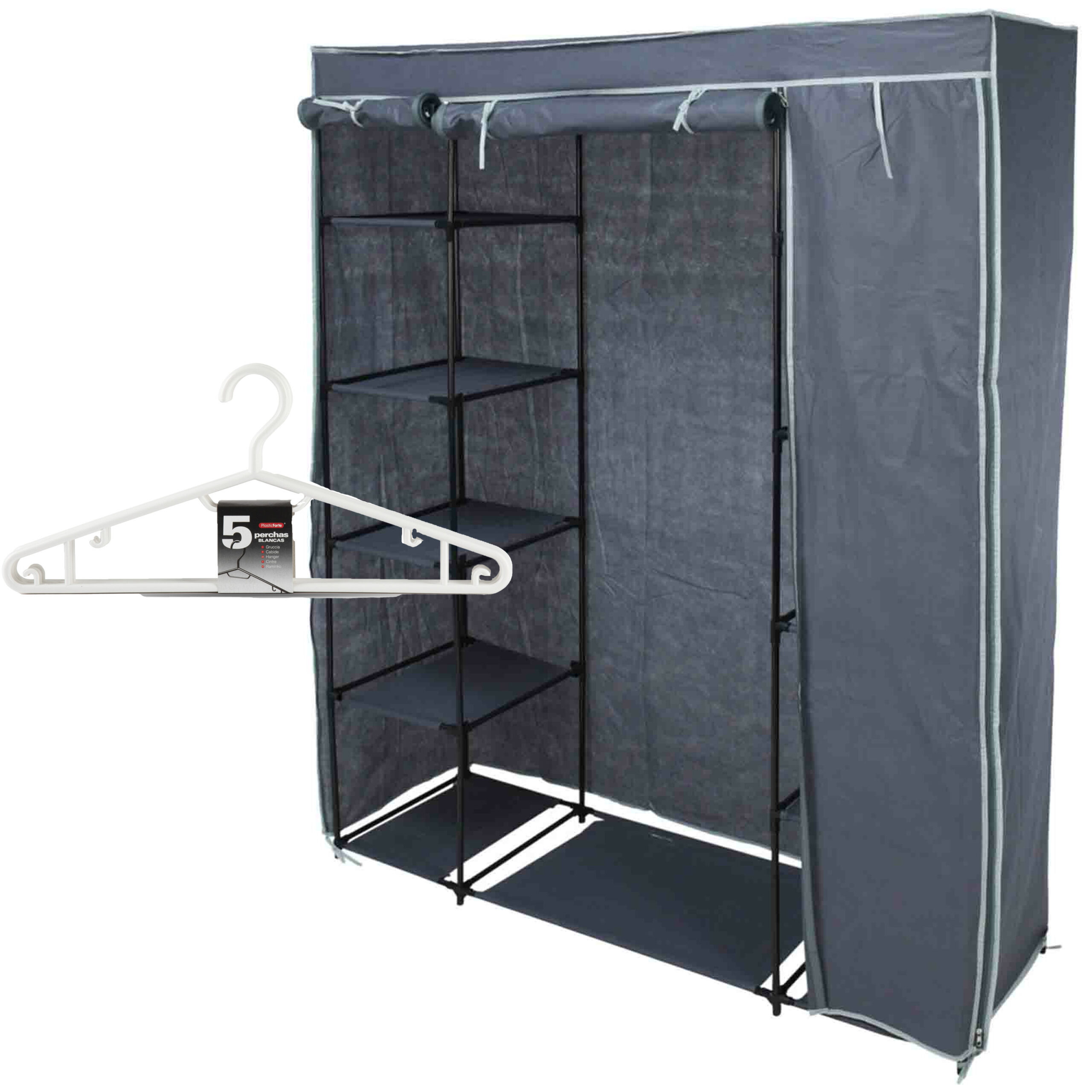 Set van mobiele opvouwbare kledingkast met blauwe hoes 160 cm en 15x plastic kledinghangers zwart