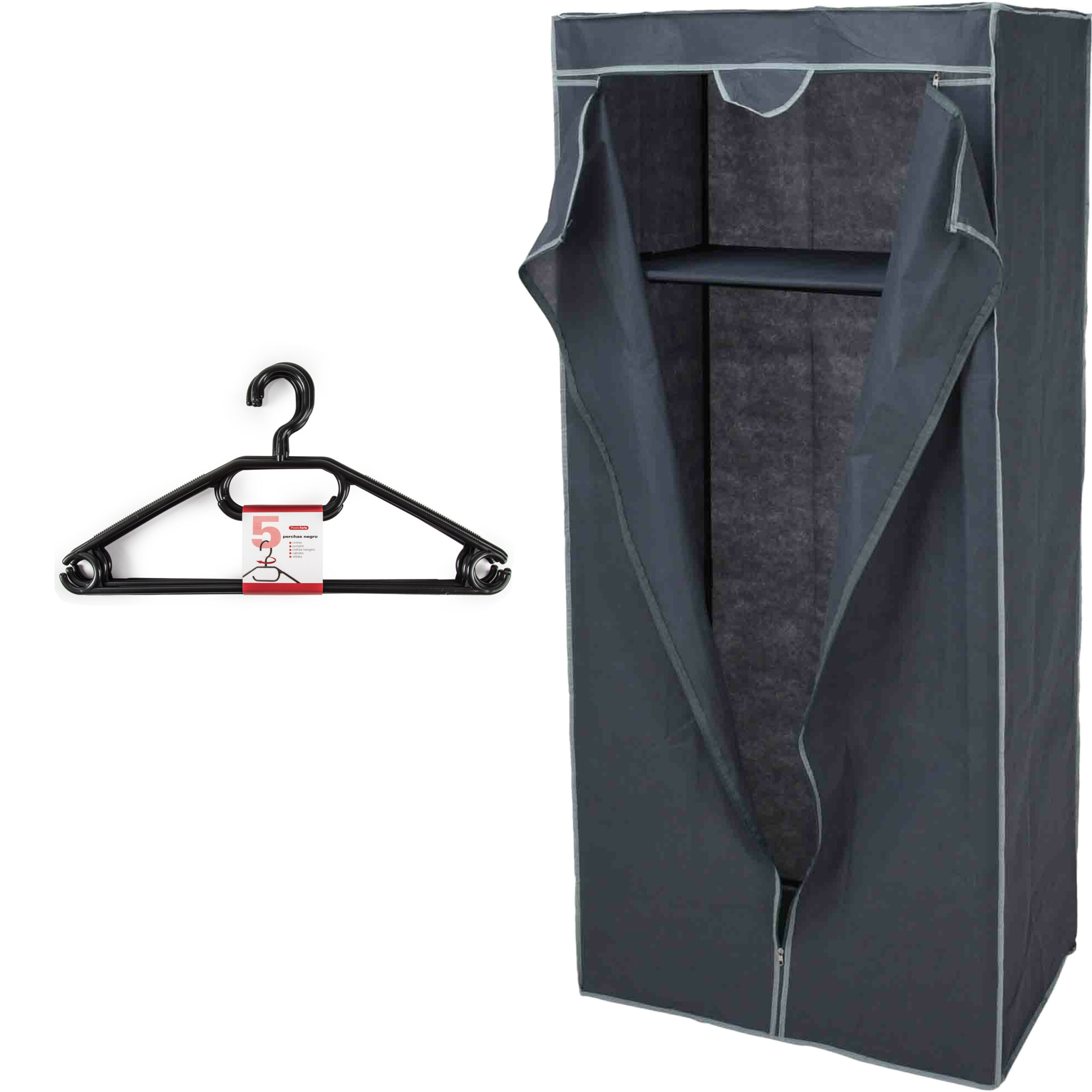 De kledinghangers zijn zwart en van kunststof. , Dit artikel bestaat uit:, 2x Kledinghangers – 5x stuks – kunststof – zwart – B40 cm, 1x Mobiele opvouwbare kledingkast – grijs – 160 cm