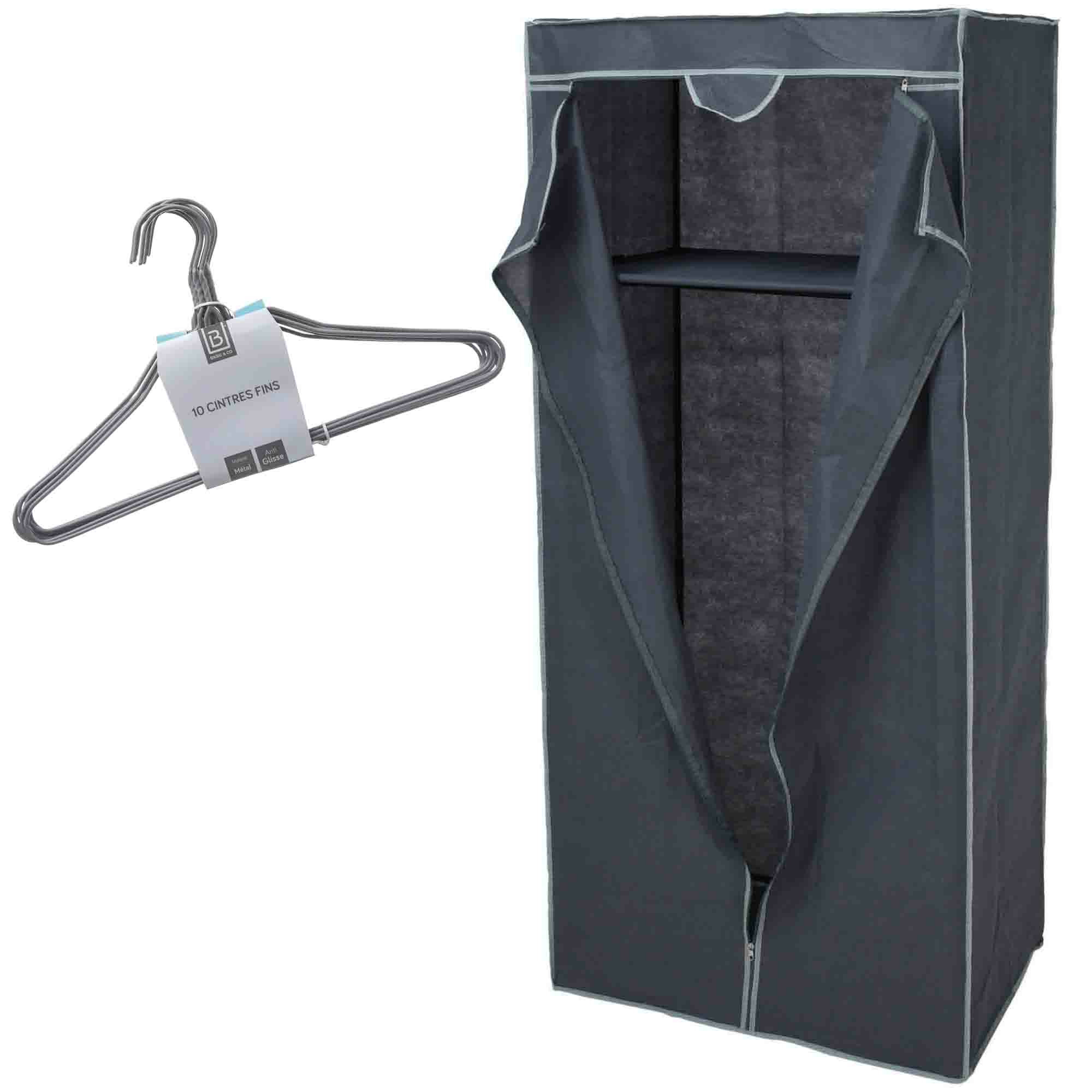 Set bestaand uit een mobiele kledingkast en kledinghangers. De mobiele kledingkast is ideaal om kleding in op te bergen, bijvoorbeeld op de camping of als extra kast op een zolder. De kast is makkelijk in elkaar te zetten. De grijs gekleurde hoes met ritsen aan de voorkant schuif je over het geraamte. Zo blijft de kleding mooi schoon. De kast heeft enkel een hang gedeelte. Afmeting: ca. 75 x 45 x 160 cm. Materiaal: metaal/kunststof.