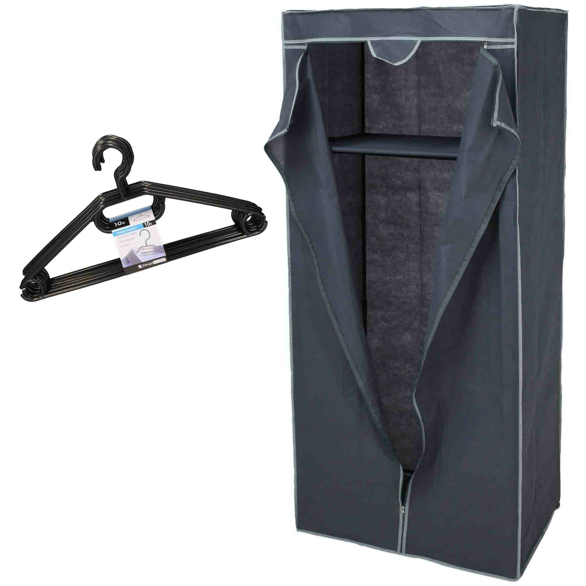 , Dit artikel bestaat uit:, 1x Kledinghangers set – 10x stuks – kunststof – zwart – kledingkast hangers, 1x Mobiele opvouwbare kledingkast – grijs – 160 cm