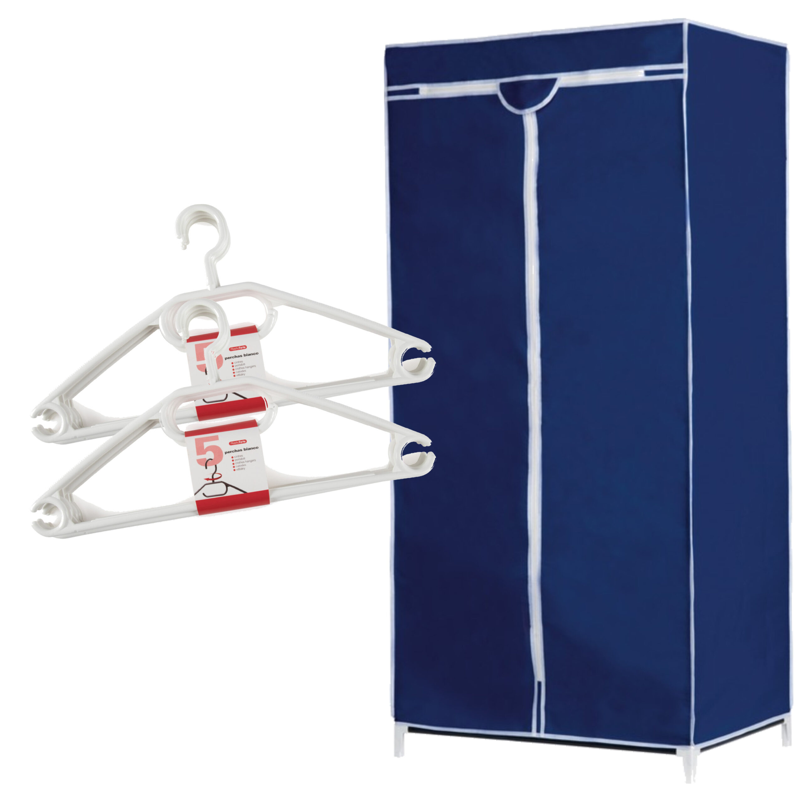 Set van mobiele opvouwbare kledingkast met blauwe hoes 160 cm en 10x plastic kledinghangers zwart