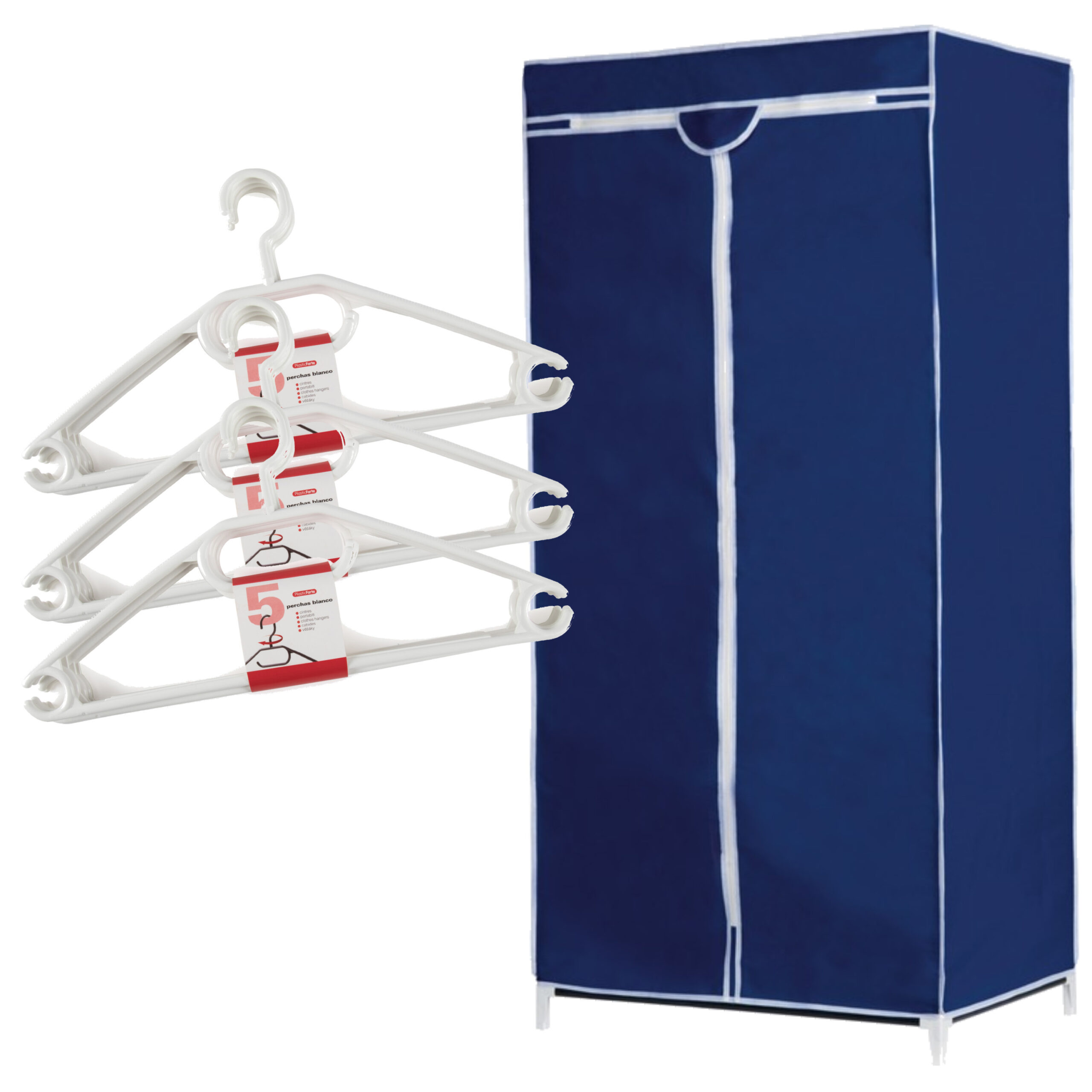 Set van mobiele opvouwbare kledingkast met blauwe hoes 160 cm en 10x plastic kledinghangers zwart