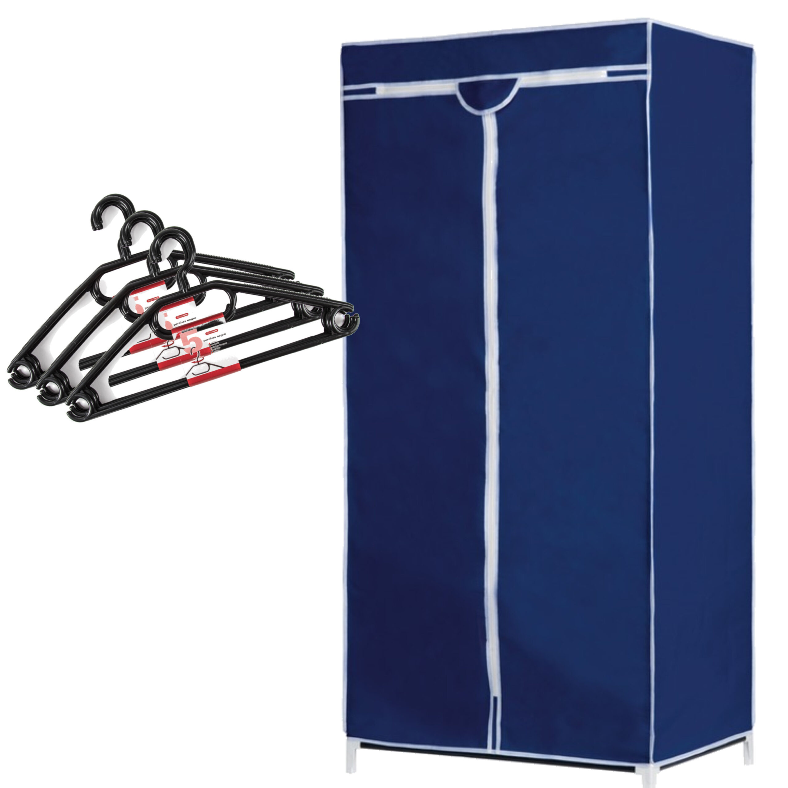 Set van mobiele opvouwbare kledingkast met blauwe hoes 160 cm en 20x plastic kledinghangers zwart