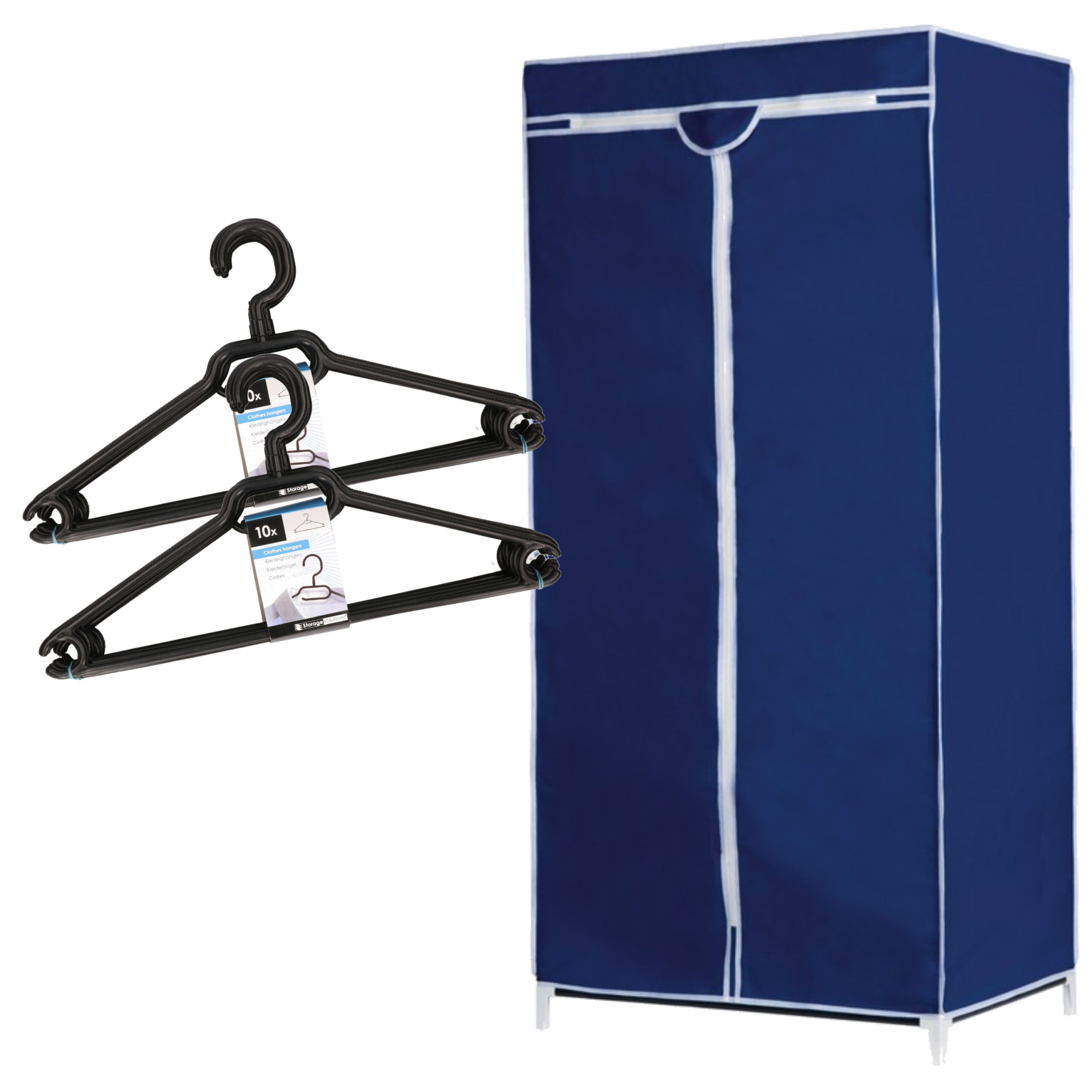 Set van mobiele opvouwbare kledingkast met blauwe hoes 160 cm en 10x plastic kledinghangers zwart