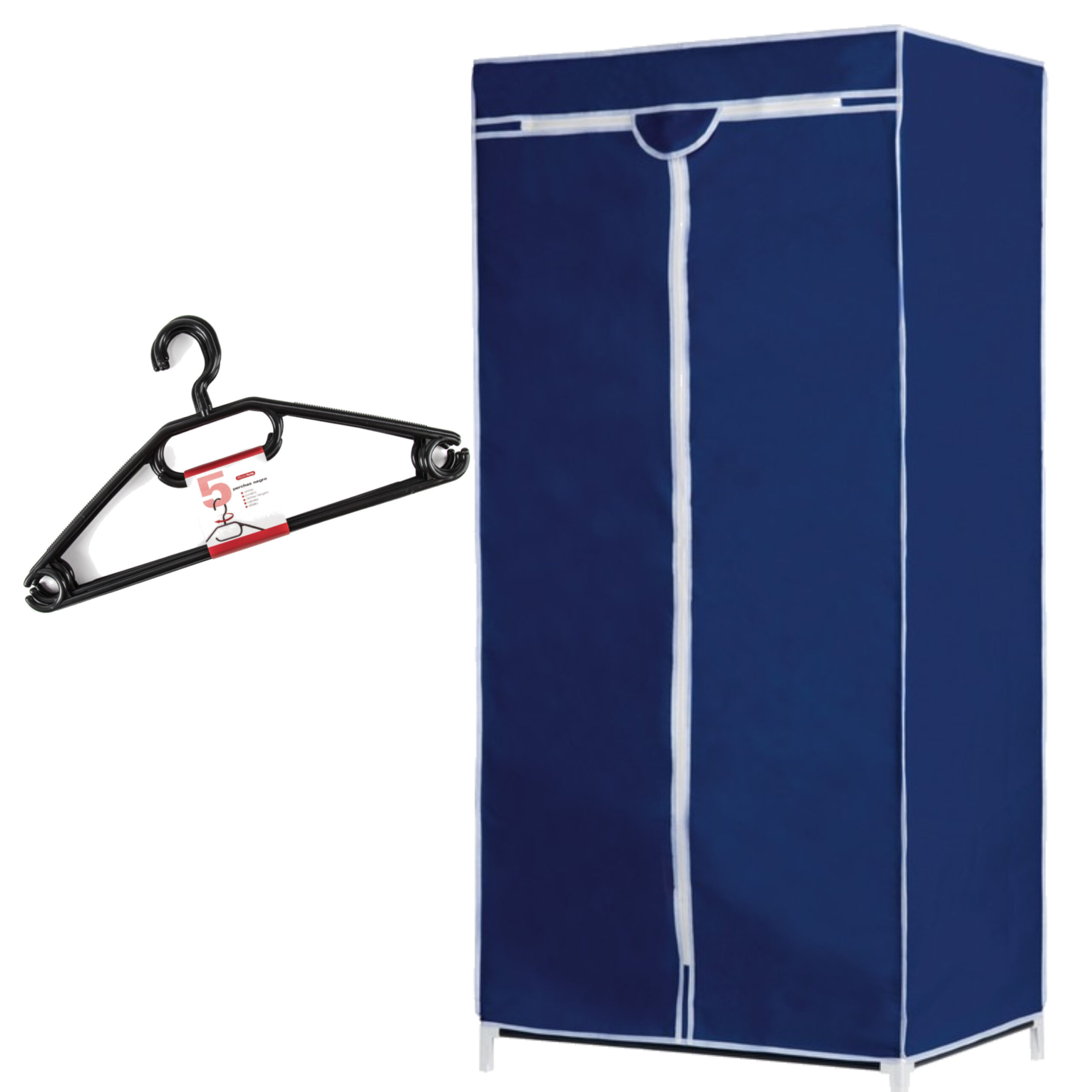 Set van mobiele opvouwbare kledingkast met blauwe hoes 160 cm en 20x plastic kledinghangers zwart
