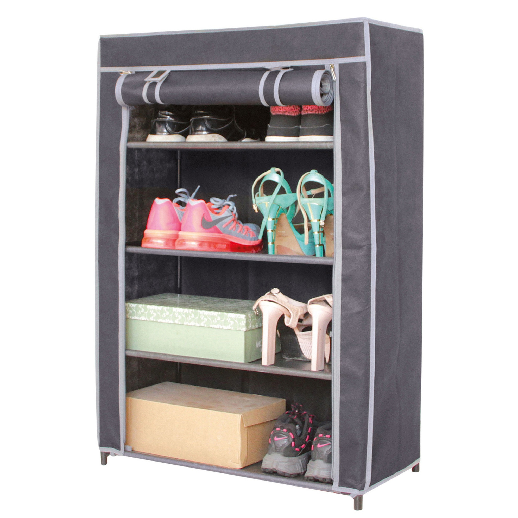 Zolder/bijzet/camping opvouwbare schoenenkast/opbergkast met legplank niveaus. Ideale mobiele kast om schoenen in op te bergen, bijvoorbeeld op de camping of als extra kast op een zolder. De kast is makkelijk in elkaar te zetten. De buitenhoes beschermt de schoenen tegen licht en stof. De kast opent aan de voorkant met rits waar de hoes opgerold en vastgezet kan worden. Afmeting: ca. L60 x D30 x H90 cm. Kleur: grijs. Materiaal: non woven stof, metaal/kunststof. Gewicht: 1.5 kilo. Merk: Urban Living.